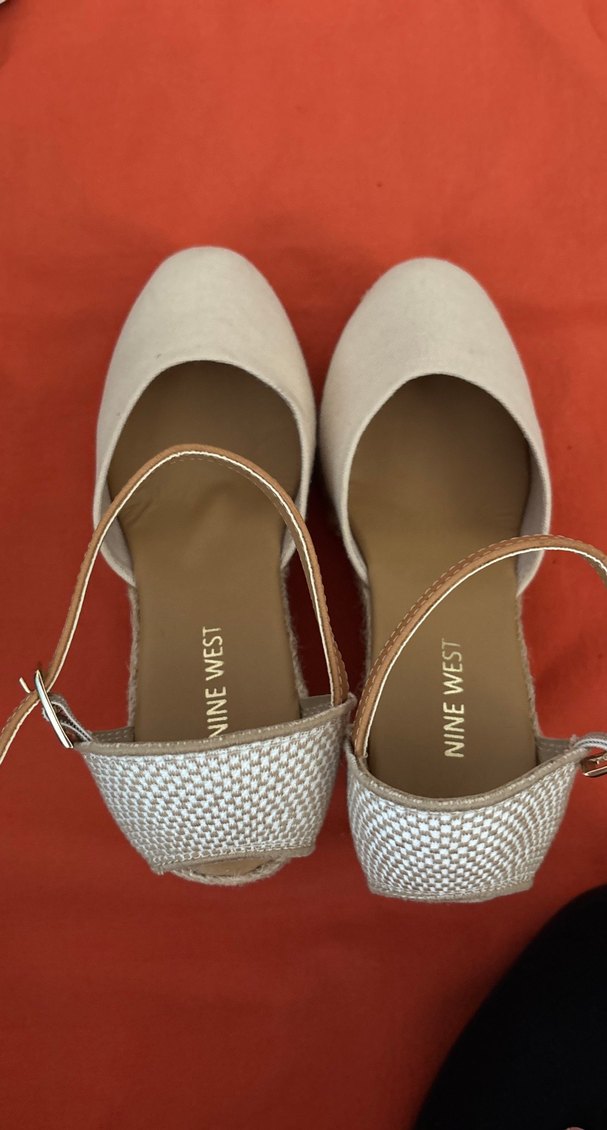 Nine West markalı beyaz dolgu topuklu espadriller, tokalı kayışlı ve gri yılan deseni detaylı. Kauçuk malzemeden yapılmıştır, düğün için uygundur.