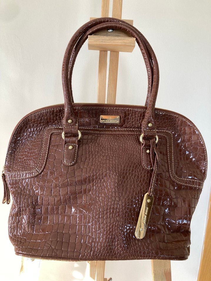 Kahverengi parlak yılan desenli deri kadın çanta, tokalı saplarla klasik zarafet ve bohem tarzı bir araya getirir. Hiç kullanılmadı. Tertemiz.