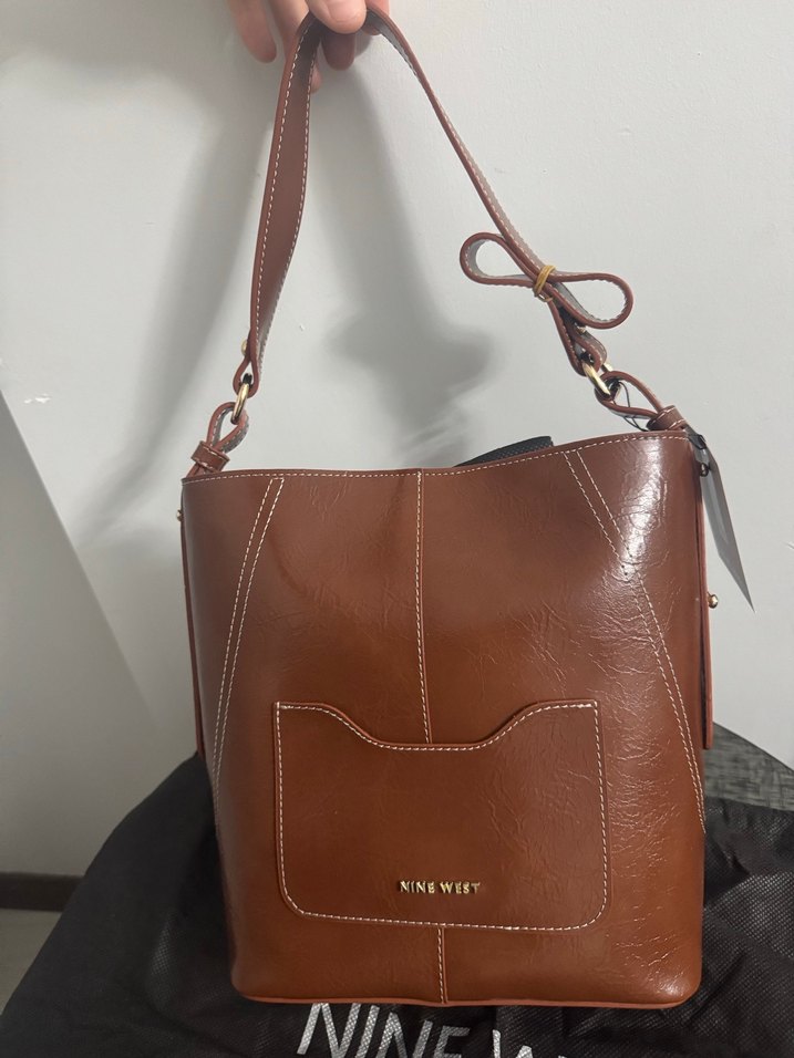 Kahverengi deri, tokalı askıya sahip kadın çantası, minimalist ve çağdaş tasarımlı, günlük kullanıma uygun. ✨nine west orjinal sıfır ürün