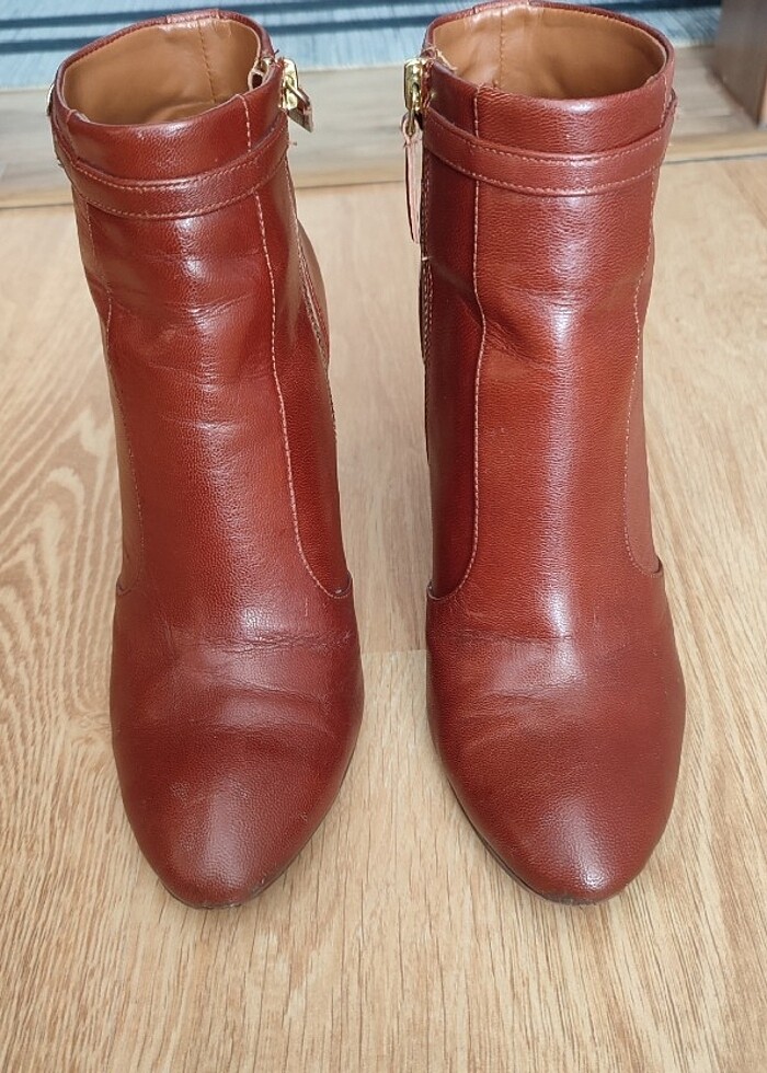 Orijinal Nine West marka 36 numaradır. Fotografta gosteriler sürtünme deformasyonlarından başka sıkıntısı yoktur. O soyulmalarda goyince aşağıda kaldigi için gözükmüyor. İnce topukludur. Ayakta çok şık duruyor.