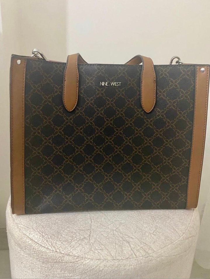 Nine West marka, kahverengi deri ve desenli, kemerli detaylara sahip modern klasik tarzda kadın çantası, ofis kullanımına uygun.