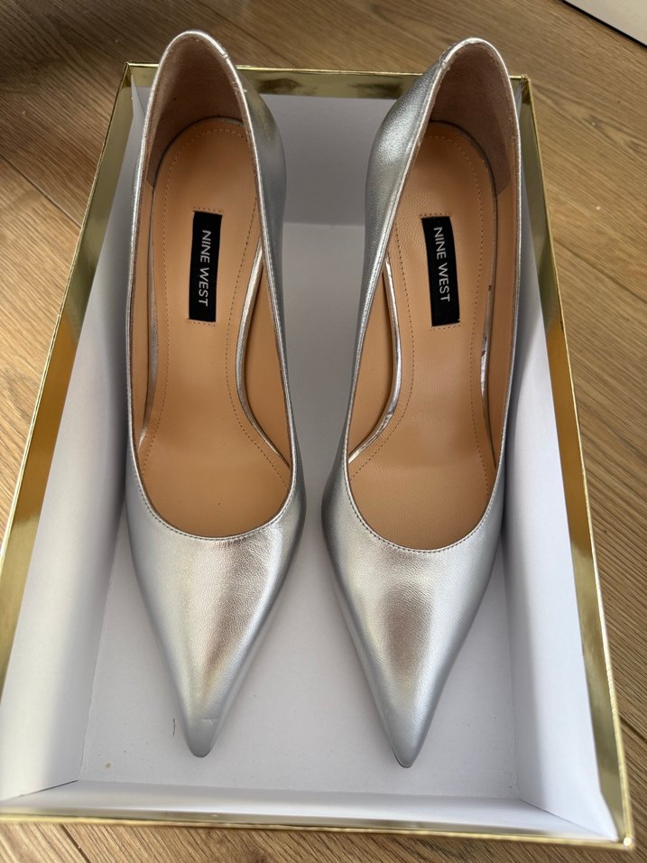 Nine West'in parlak gri metal stiletto topuklu kadın ayakkabısı, sivri burunlu ve ofis için uygun. ✨