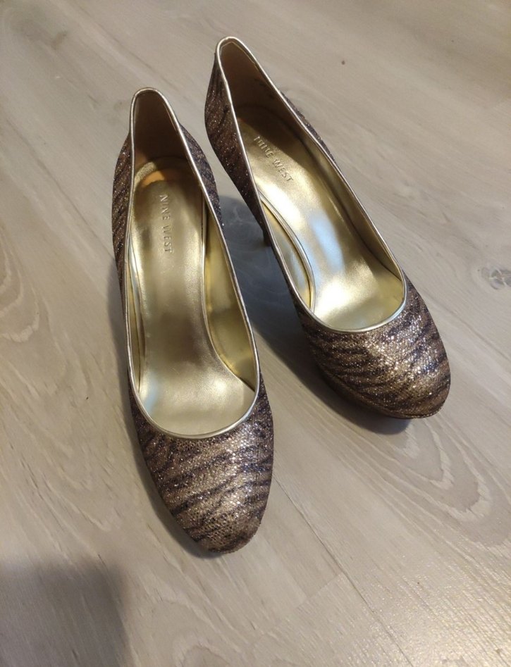 Nine West Mendoza Gold platform stiletto. Pudra tonlarında, pırıltılı bir ayakkabı. Sadece 1 gece ve iç mekanda kullanıldı. Yüksek topuklu olmasına rağmen rahat bir model, çok şık.