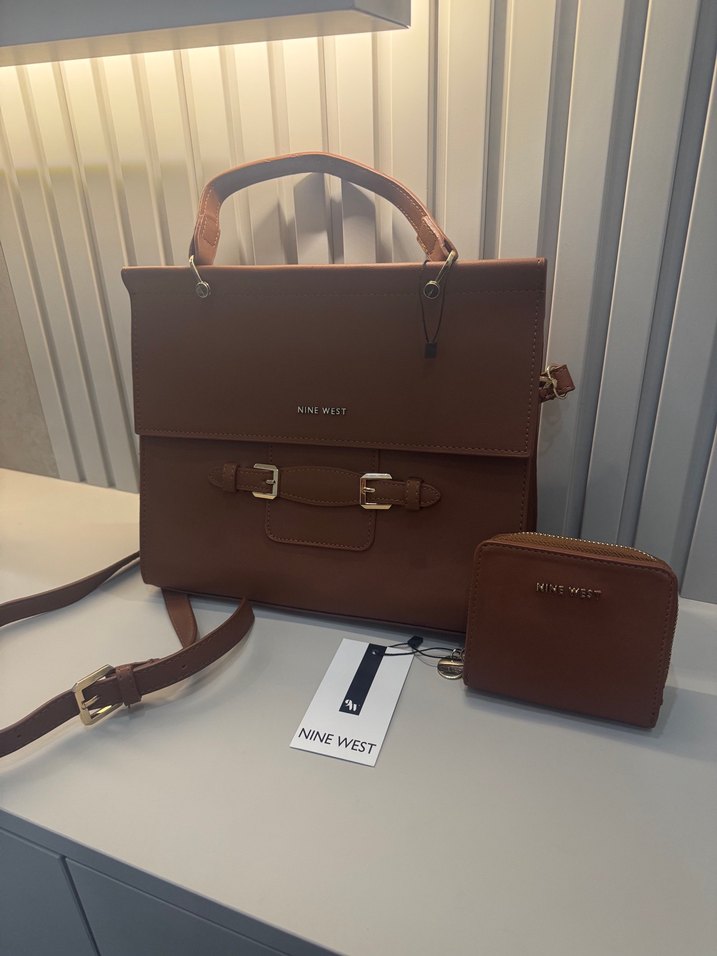 Nine West marka, kahverengi deri kadın çanta, kemer detaylı ve modern klasik tarzda, ofis kullanımı için is uygun. Yanında uyumlu cüzdan da bulunur. Geri iade yoktur cüzdanla takım