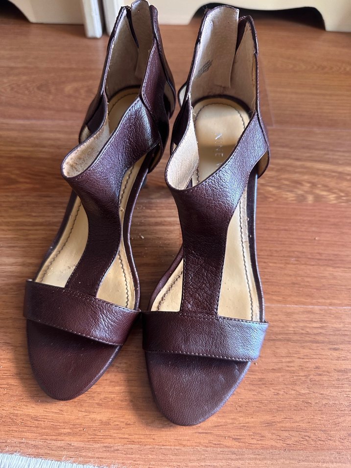 Nine West Kahverengi deri dolgu topuklu sandalet tokalı kayışlı, minimalist ve çağdaş tasarıma sahip, ofis kullanımı için uygun topuk boyu 7 cm 36 beden yurt dışından alınmıştır iç kısmında dökülmeleri mevcut lostralarda yaptırılabilir