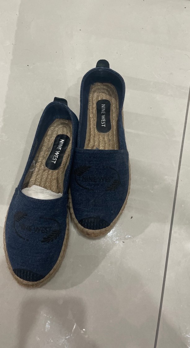 Nine West mavi denim espadril, dolgu topuklu, nakış detaylı, günlük kullanım için rahat ve şık sokak stili ayakkabı.