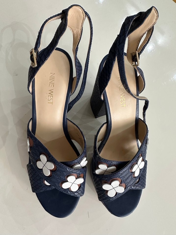 NINE WEST marka, koyu mavi renkli, çiçek desenli ve tokalı bantlı platform topuklu kadın sandalet. Trendy ve bohem tarzda, romantik akşamlar için uygun. Ürün az kullanılmış olup herhangi bir defosu yoktur. Topuk boyu: 11 cm