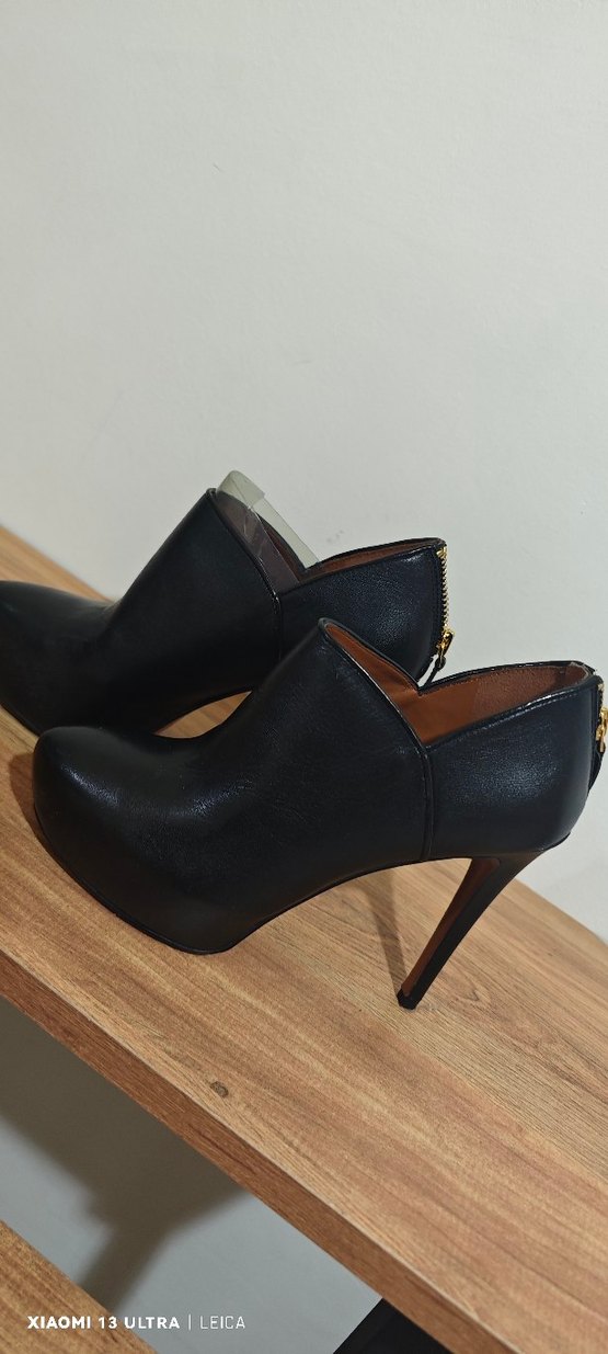 Siyah deri, stiletto topuklu kadın botları, tokalı detay ve çağdaş desenli tasarımla ofis kullanımı için uygun.