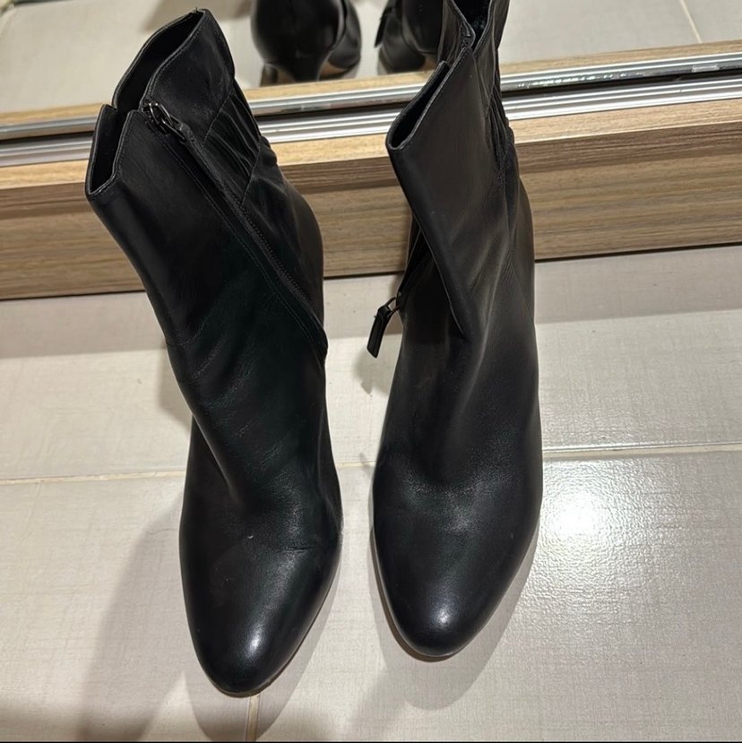 Siyah deri kadın bot, stiletto topuklu ve tokalı, şık ve modern tasarımıyla ofis kullanımı için uygundur. Çok az kullanılmış, defosuz, yüksek-ince topuklu, 40-41 numara ile uyumludur.