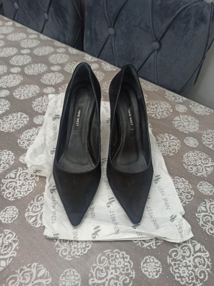 Siyah süet stiletto topuklu, sivri burunlu klasik tasarım. Ofis için uygun, zahmetsiz şıklık sunar. Koyu renk ve desensiz, Paris esintili zarafet içerir. hiçbir sorun yok Bir defa kullanıldı