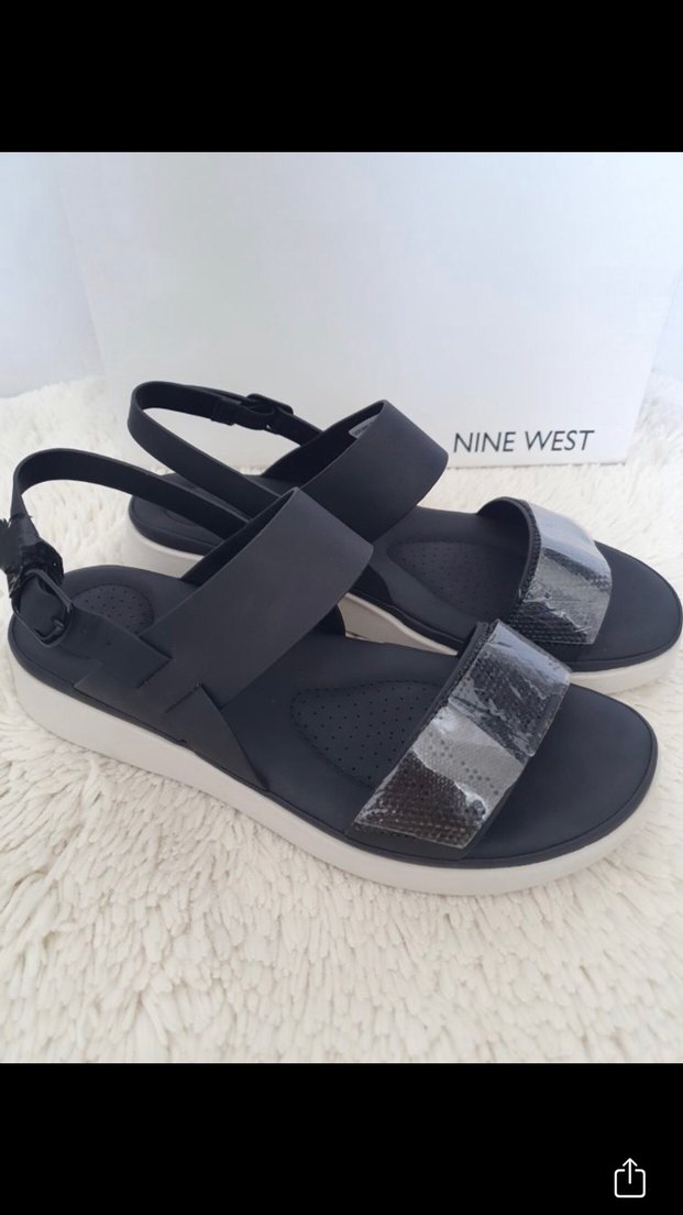 Nine West kadın sandalet, dolgu topuklu, siyah yılan desenli kayış ve tokalı tasarıma sahip. Kauçuk malzemeden, çağdaş athleisure stilinde, günlük kullanıma uygun.