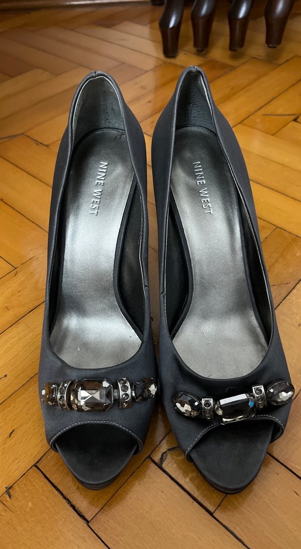 Nine West markalı siyah yüksek topuklu kadın ayakkabısı, tokalı ve desenli detaylara sahip, romantik akşamlar için uygun.