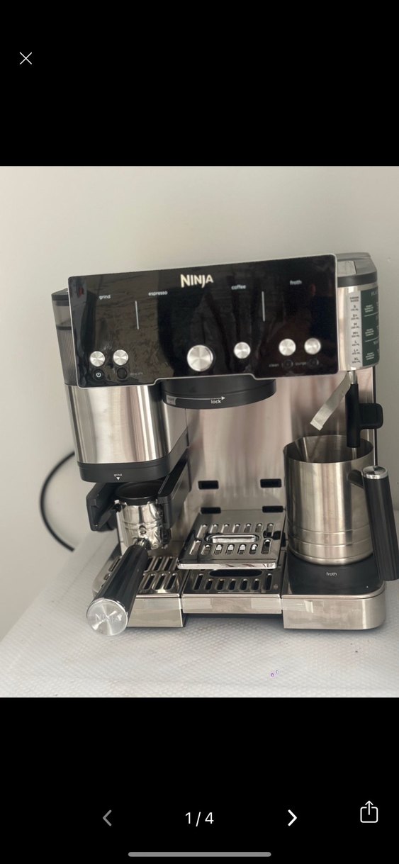 Koyu gri renkte Ninja kahve makinesi, paslanmaz çelik tasarıma sahip. Espresso ve kahve için çeşitli demleme seçenekleri ve süt köpürtücü içerir. ☕️ Fişi bulunmamaktadır