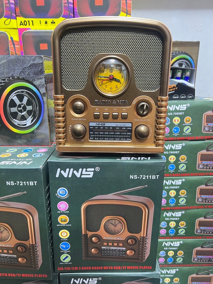 NINS NS-7211BT, AM/FM radyo ve USB/TF müzik oynatıcı özellikli, kahverengi retro tasarımlı renkli müzik sistemi, entegre saatli.