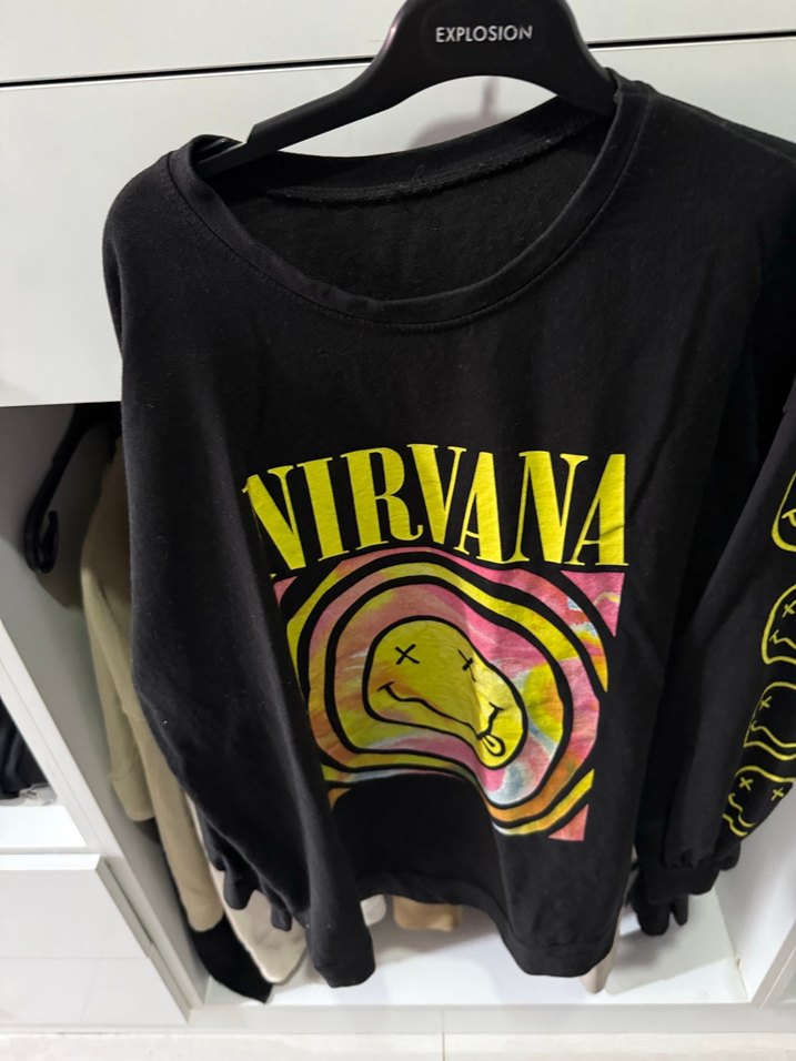 Pamuk siyah sweatshirt, bol kesim, bisiklet yaka ve uzun kolludur. Canlı renklerde Nirvana baskısı ve cırt cırt detayları içerir, grunge punk stiline uygun.