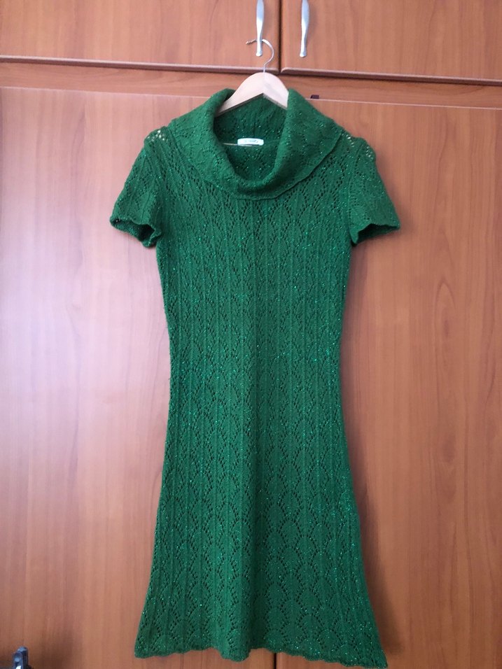 Parlak yeşil renkli, yüksek yakalı ve kısa kollu, vücuda oturan örgü midi elbise. Rahat bohem tarzıyla günlük kullanıma uygundur. Nirvana marka