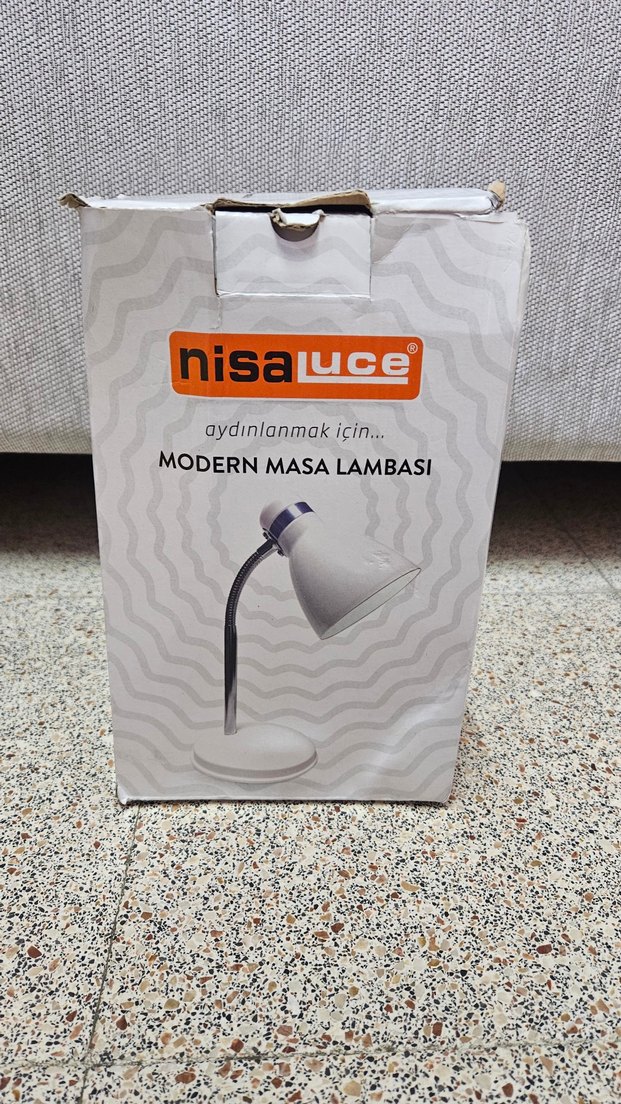 Nisaluce markasının beyaz renkli, ayarlanabilir modern masa lambası. Esnek boyun yapısıyla pratik aydınlatma sağlar.