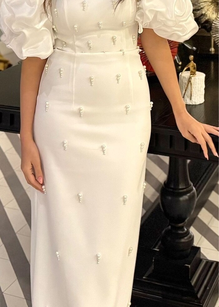 Bir kez nişanda giyildi, inci taşlı abiye, özel üretim, beyaz