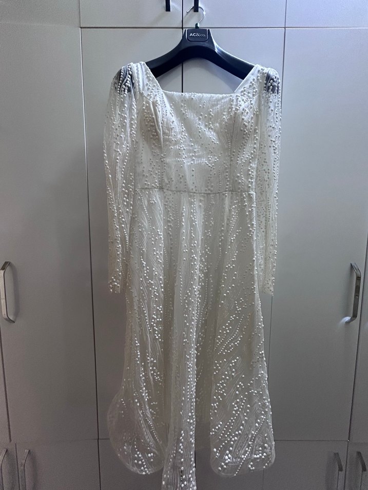 Nakış işlemeli, uzun kollu beyaz elbise, vintage ve bohem tarzı şıklığını yansıtıyor. 1 kere giyildi. Tertemiz ve sıfır hiç bir kusuru yoktur. M bedendir.