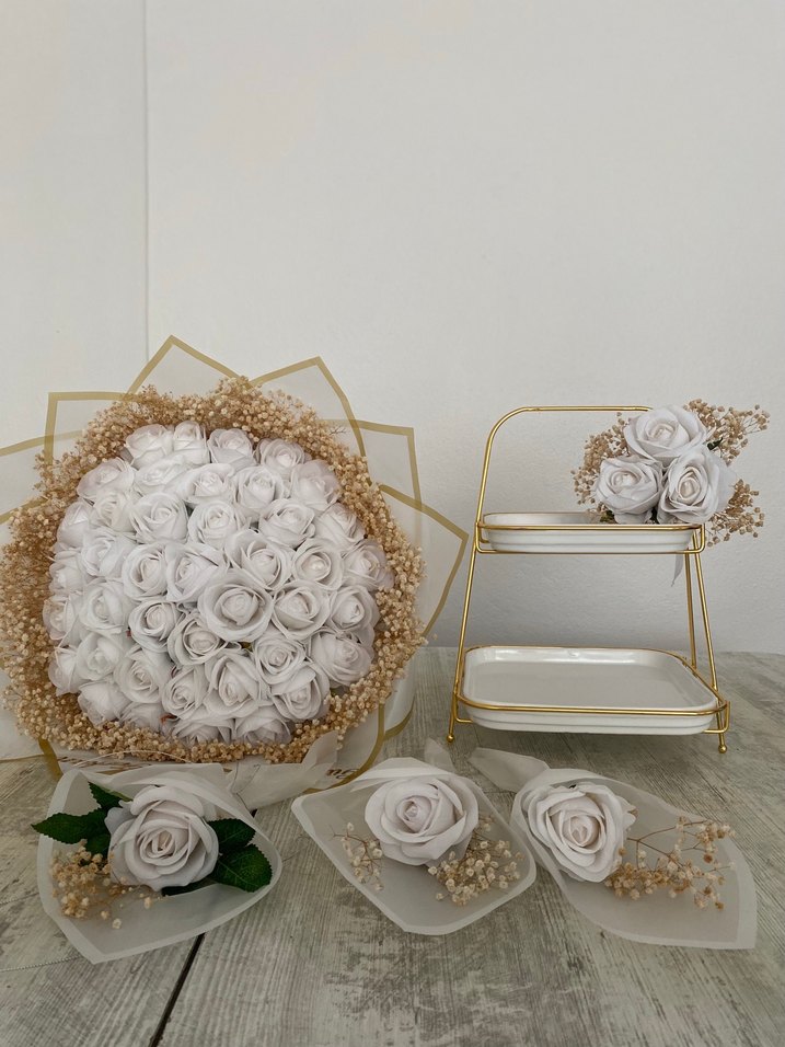 Hiçbir kusuru yoktur. 41 adet gül. Porselen çikolata sunumluğu 3 adet aile buketi tüm resimdeki parçalarla gönderilecektir
