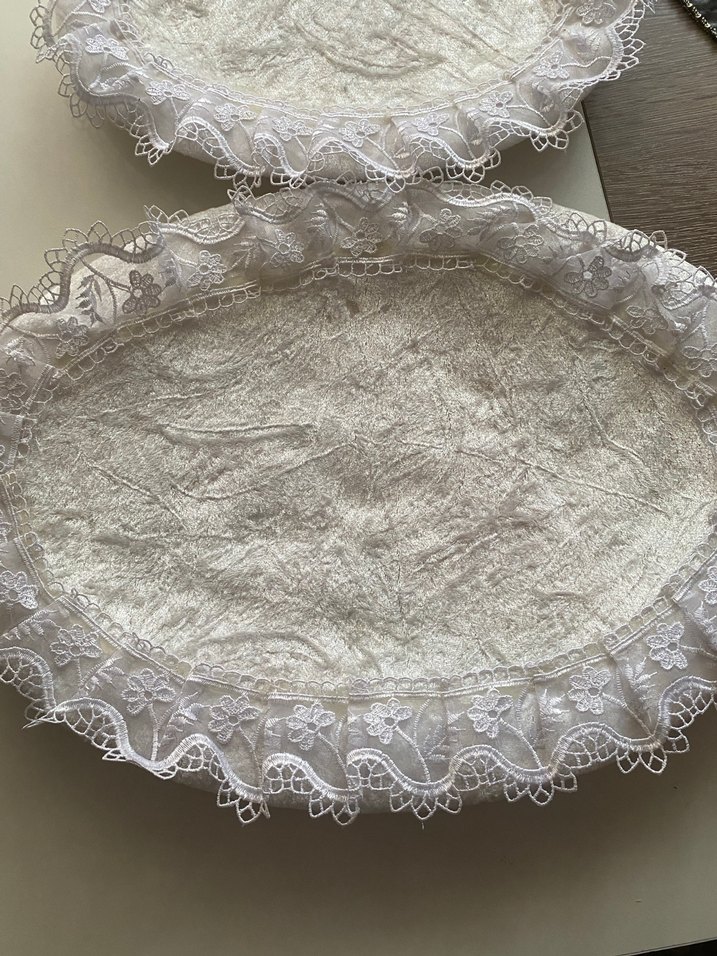 Oval şekilli, beyaz ve gri tonlarda işlemeli çiçek desenli masa örtüsü, klasik dantel kenarıyla tamamlanmıştır. Küçük 200 büyük 300 el yapımı kullanılmamış
