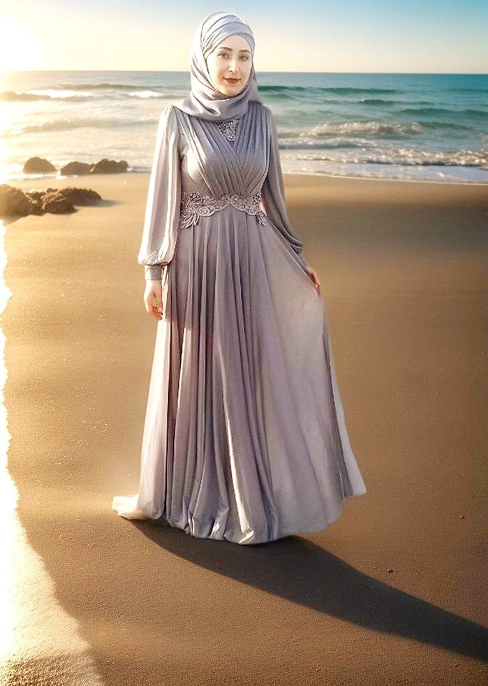 ✨ Şıklığın ve zarafetin birleşimi! Gri dışı tül kaplı, uzun kollu ve uzun etekli bu elbise; özel günlerinizde göz alıcı bir görünüm için ideal. 38 beden