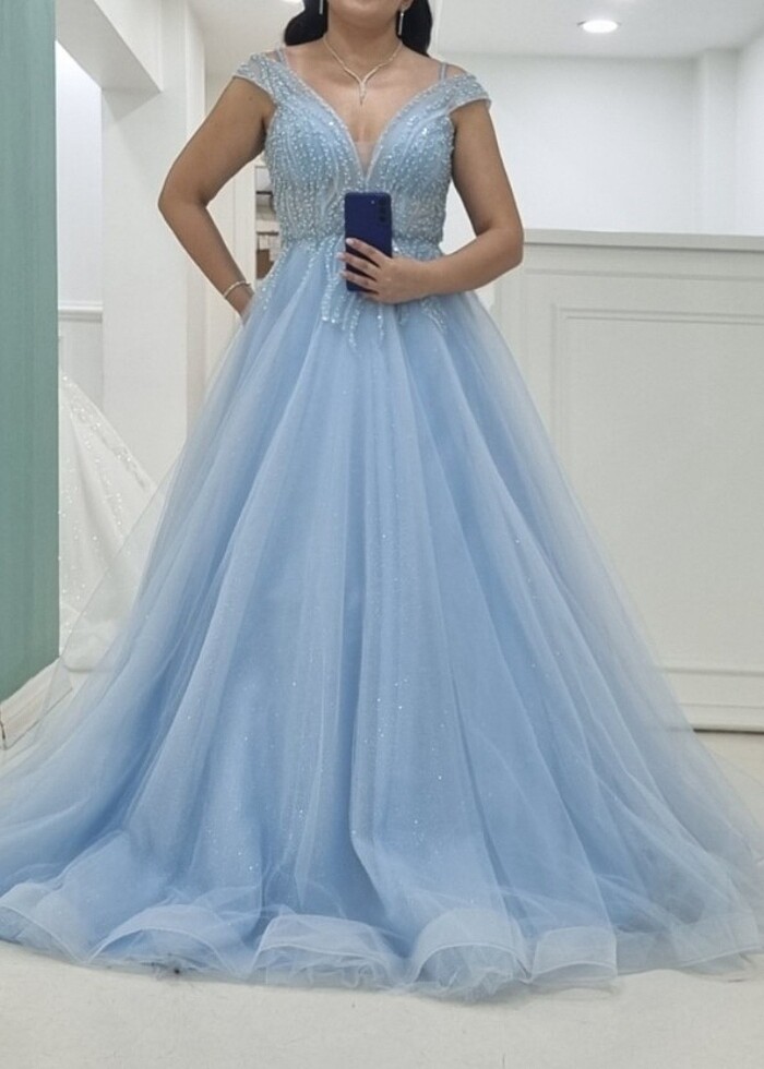 Her ne kadar giymeye doyamasam da sadece 3 saat nişanımda 1 defa giydim. Arka kısmı gelinliklerdeki gibi saten floş ipli olduğu için her bedene uyumlu olur. 2. fotoğraftaki hali yüksek platform topuklu ile duruşudur boyu yeterince uzundur. Hem ince ipli askısı hemde madonna yaka askısı mevcut ister ikisi aynı anda ister son fotoğraftaki gibi ince ipli askı saklanarak tek yaka kullanılabilir. Tarlatan ve tacı kiraladığım için onlarsız yollayacağım alacak kişiye şimdiden hayırlı olsun.