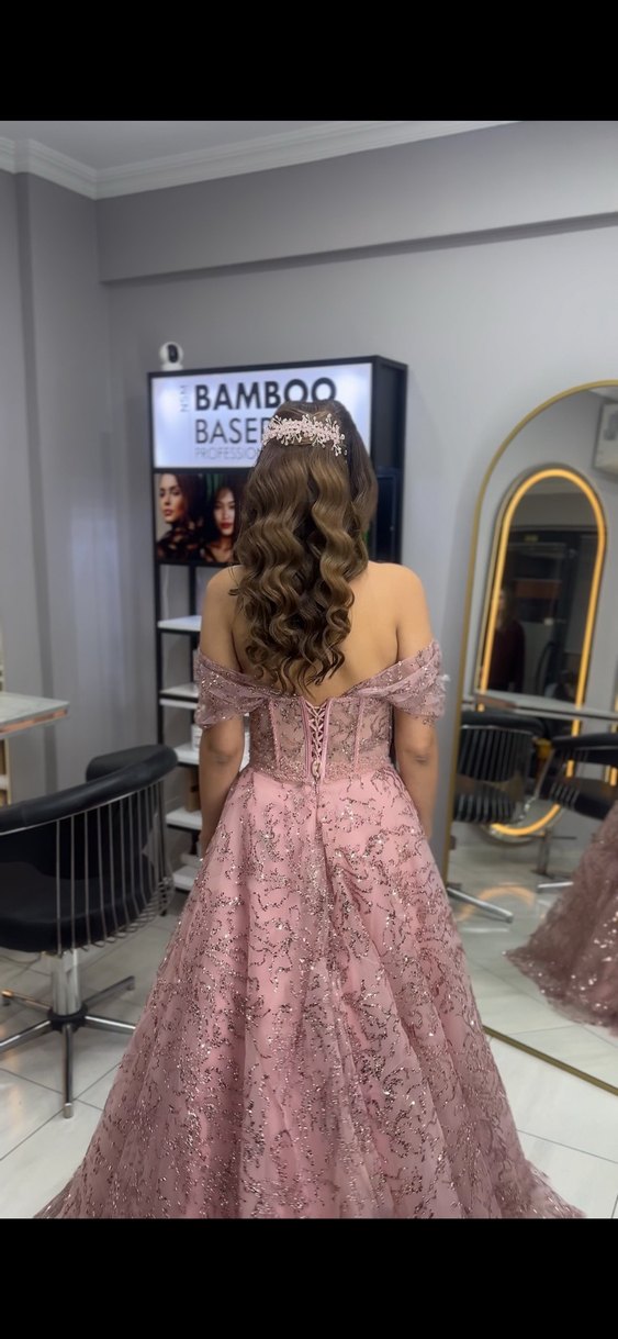 Arkası ipli 50 kilodan 70 kiloya kadar herkese olur düşük kol boncuk işlemeli nişan elbisesi