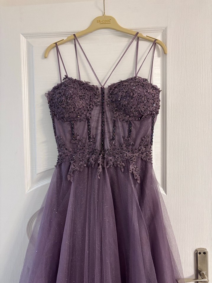 askılı ve straplez yaka,kollu işlemeli ve boncuk detaylı mor uzun nişan abiyesi