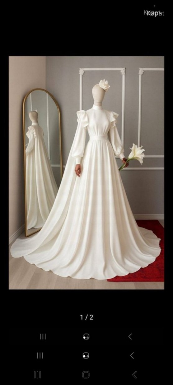 Uzun beyaz gelinlik, yüksek yakalı, uzun kollu, drapeli ve klasik modern şıklığı yansıtan regular fit kesime sahiptir.