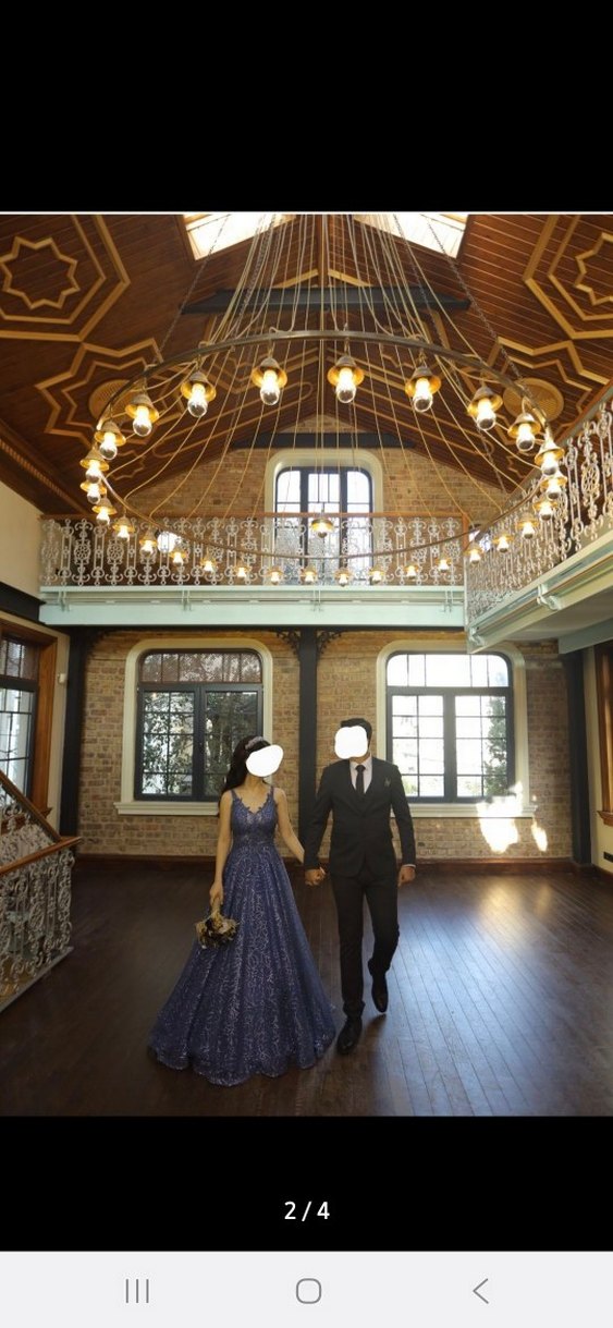 Koyu mavi, transparan detaylı, uzun ve vücuda oturan abiye elbise. Notched lapel yakalı ve askılı kolludur, gotik klasik şıklığını yansıtır.