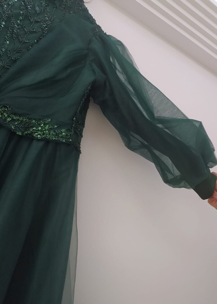 Ürünü sadece nişanımda 1 defa giydim, herhangi hiçbir defosu yoktur. Tasarımcı tarafından özel dikim yapıldı rengi koyu yeşil olup 48 - 50 bedene göre dikilmiştir. Tül , dantel , ve pul detayları ile birlikte çok şık nişan elbisesidir. Düşünenler benimle iletişime geçebilirler..