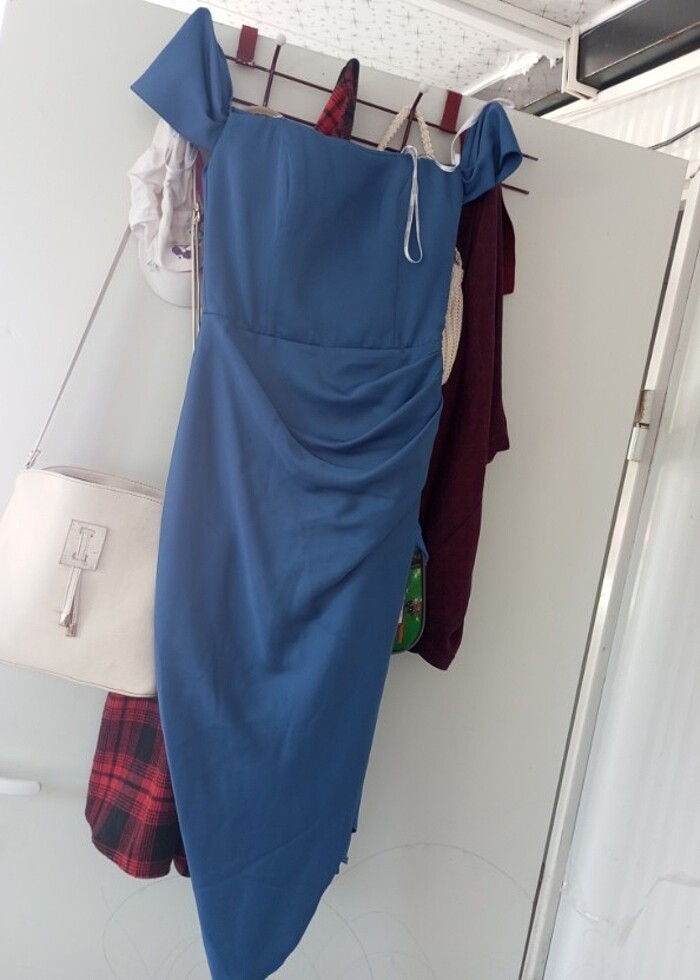 Sadece 2 saat giyildi çekim için ve askıları mevcuttur paketin içinde Diz üstüne kadar yırtmacı var