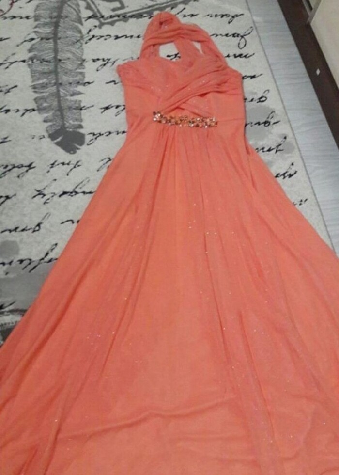 Somon rengi. İki kere giydim. Dekoltesi kapansın diye sırttan çapraz yaptırmıştım askıları. Bu tadilat yapıldı. İstenirse eski haline dönebilir.