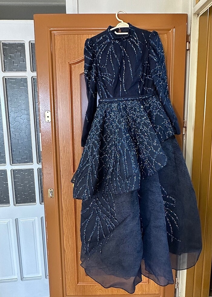 Tesettür nişan elbisesi sadece bir kere nişan da giyildi katlı yapıştırma pul detaylı modele sahiptir fotoğrafta gördüğünüz keçe kumaştan çift kat vardır kendi içinde ekstra astar mevcuttur yapıştırma silikonlar mevcuttur 40 beden uyumludur sevgiler. :)