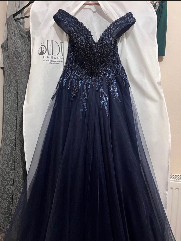 Lacivert, boncuk işlemeli, V yakalı ve kolsuz uzun, A kesim elbise. Kayık yaka bir modeldir. Ölçüleri son fotoğrafta mevcut. 1.67 boy 55-60 arası bir kilo ile giyildi. Lüleburgaz Sedef gelinlik mağazasından alındı. Nişanda 2-3 saat giyildi temizlemesi yapıldı. Edirne’den kargoya verilecektir. (Marka temsili olarak yazıldı)