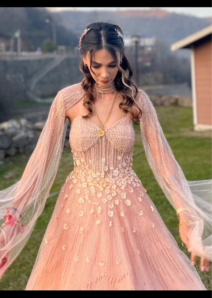 Boyum 164. 9 cm topukluyla tam yere değiyor işte. Resimlerde spor ayakkabı kullandım o yüzden yere değiyo bayağı. Rengi somon, soğan kabuğu, açık pembe arasında bir renk. Işığa göre bazen farklı çıkıyor.Elbiseyi ben şuan32-34 bedene göre yaptırdım. İçten daraltıldı.Ama açıldığında 36-38-40 beden de giyebilir.İçine sütyen pedi diktirdim göğüslerim dolgun dursun diye isteyen terzide çıkarttırabilir. Ben elbiseye ince bir askı yaptırdım ama o koptu, koptuğu için kurdaleden kendim askı diktim.Askısız da kullanabilirsiniz ama benim üstümden kaydığı için ben askıyla kullandım.Elbisede herhangi bi yırtılma kirlenme yok. Sadece üstten bi kaç pul düşmüş. Tarlatanı var iki katlı onu da yollayacağım