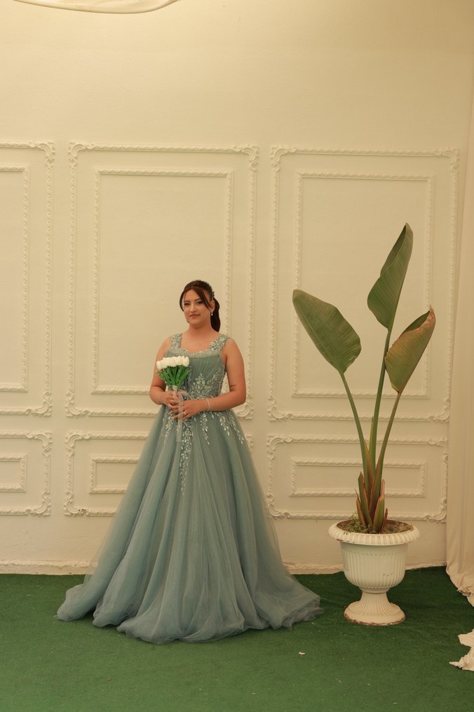 Çiçek desenli, askısız ve kolsuz bu yeşil abiye elbise, drapeli ve uzun boyludur. Düzenli kesimiyle bohem ve klasik zarafeti yansıtır.
