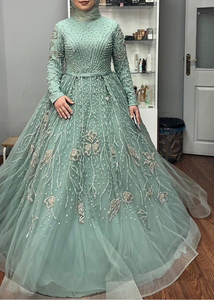 Su yeşili nişan kıyafeti sıfır alındı 1 defa giyildi defosu yoktur 40 beden daraltma tadilatı filan yapılmadı