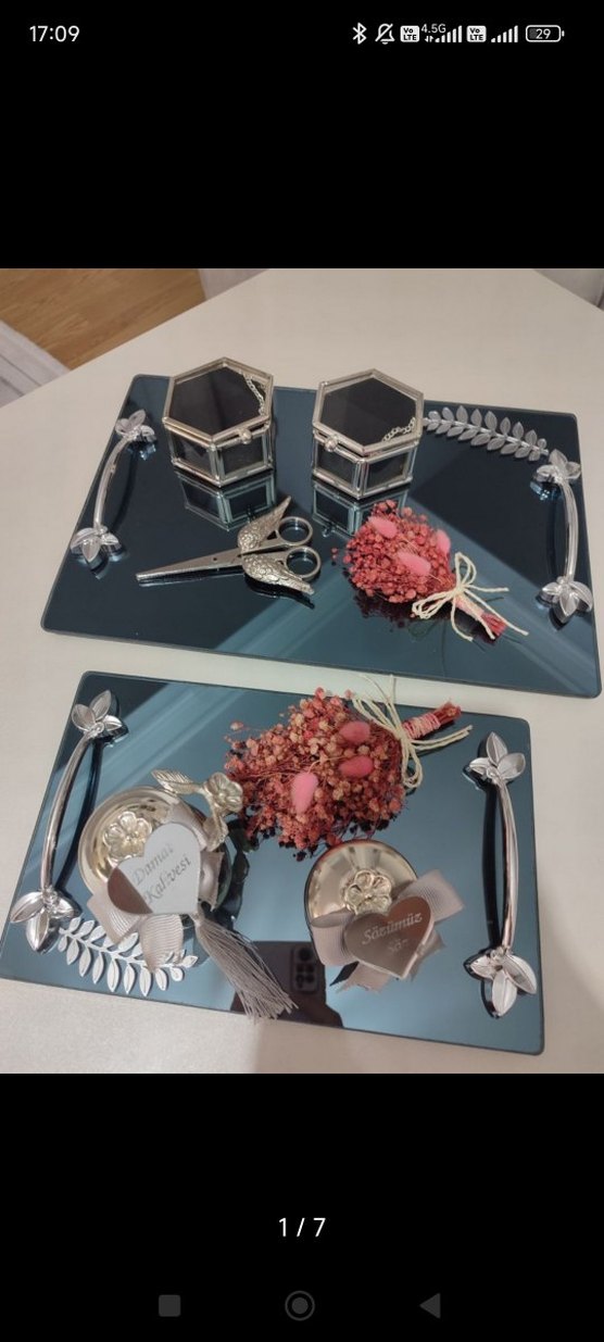 Bordo renkte, koyu tonlu bohem tarzda çiçek desenli, dekoratif saplı iki tepsi ve küçük altıgen kaplar içeren set. Ürünler cam,2 tepsi,2 yüzük kutusu,1makas,1 damatfincanı, 1 lokum kutusu,2 çiçekten oluşuyor. Damat fincanı ve lokum kutusunda hafif lekeler var. #söztepsi #nişantepsi #söz #nişan #damatfincanı #gelin #nişan