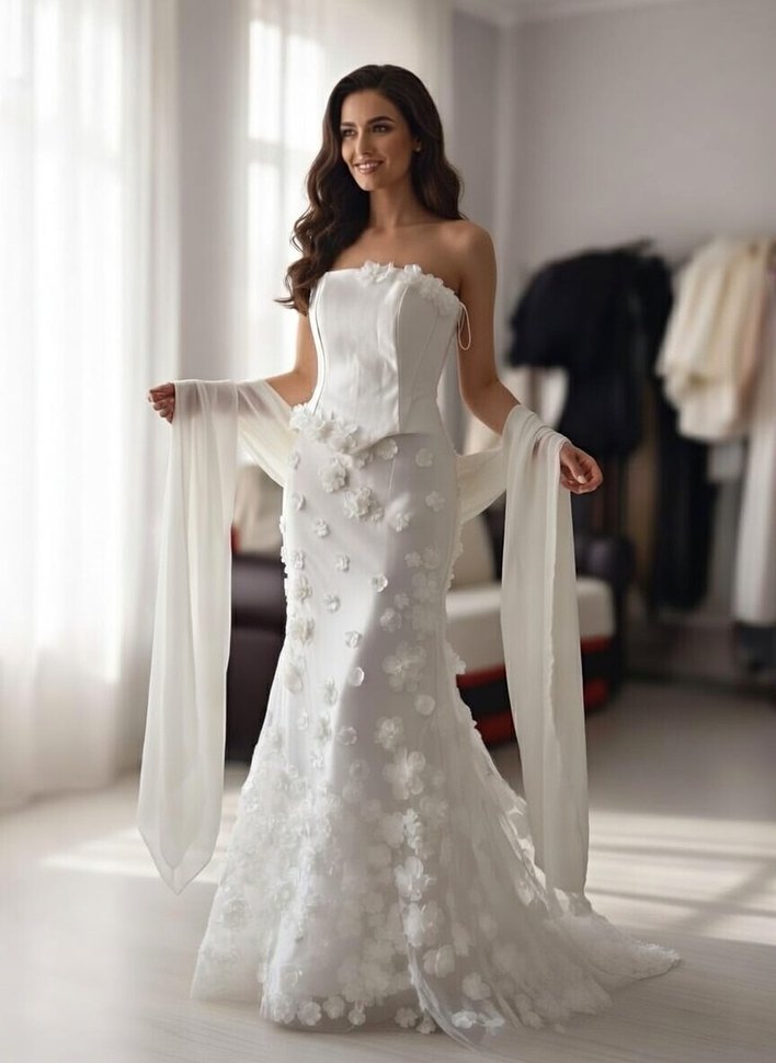 Beyaz straplez 3 lu takım Sali da var arkası bağcıklı kuyruklu duruşu çok güzel