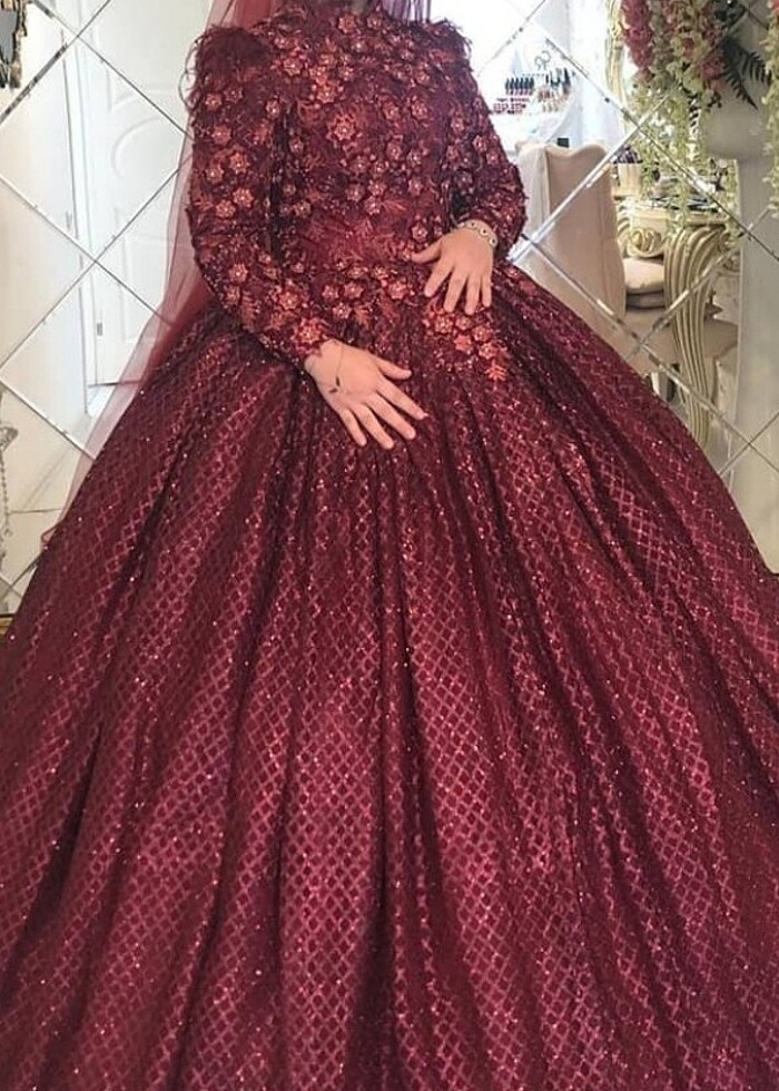 Ürün temizdir 1 kez kullanıldı yırtık sökük yok bordo rengi prenses model nişan kıyafeti üst kismi üç boyutlu çiçeklerle süslenmistir.38-42 beden e uygundur.