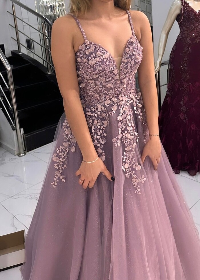 1 kere nişanımda giydim temiz arkası bağlamalı boyum 165 ben altına 4 cm topuklu ile giydim lila rengi ben 15 bin tl ye aldım abite değil nişanlık
