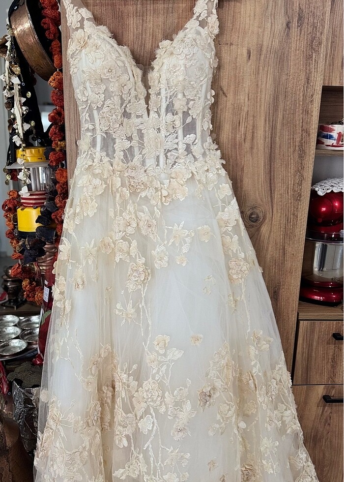Özel dikim yaptırmıştım. Fotoğraflarda belirttiğim kısımda ufak bir söküğü mevcut yaptırılabilir. Kuru temizleme gerektiriyor. Duvağıyla tarlatanıyla birlikte vereceğim
