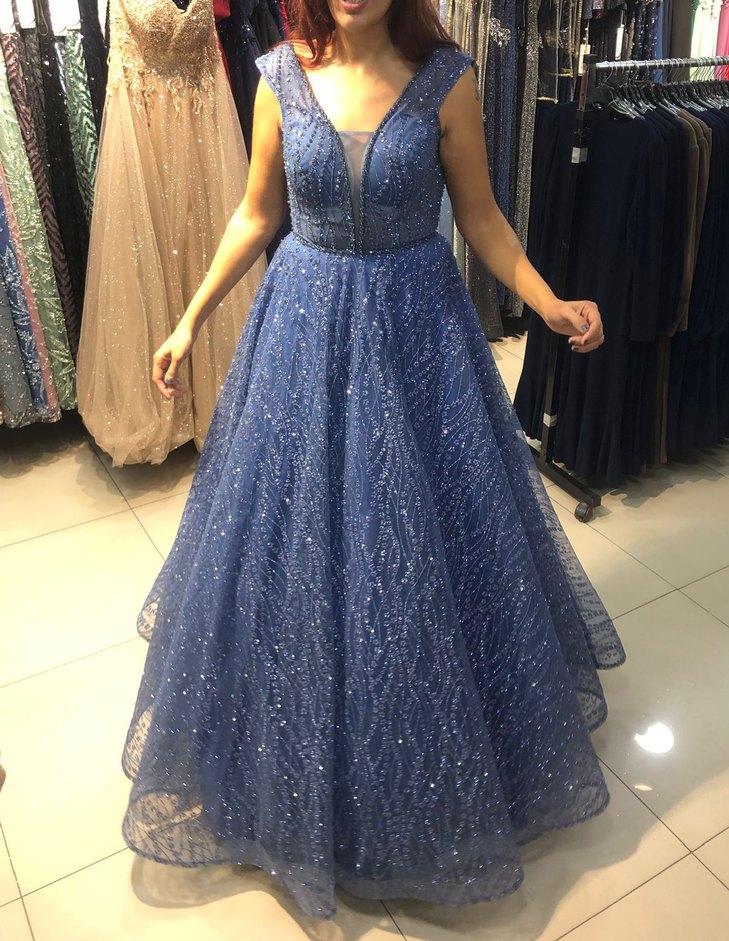 Mavi, işlemeli, V yakalı, kolsuz uzun abiye elbise. Parlak detayları ve şık kesimi ile nişanlık olarak yada düğünlerde Rahat kesim, çağdaş stil. 1 beden kızım nişanında giydi bu arada kızım 40, 42 beden arasında. 1.2 saat giyildi.arkası ipli olduğu için 38,40,42 beden arası rahatlıkla giyer. yanında tarlatanıda vereceğim.