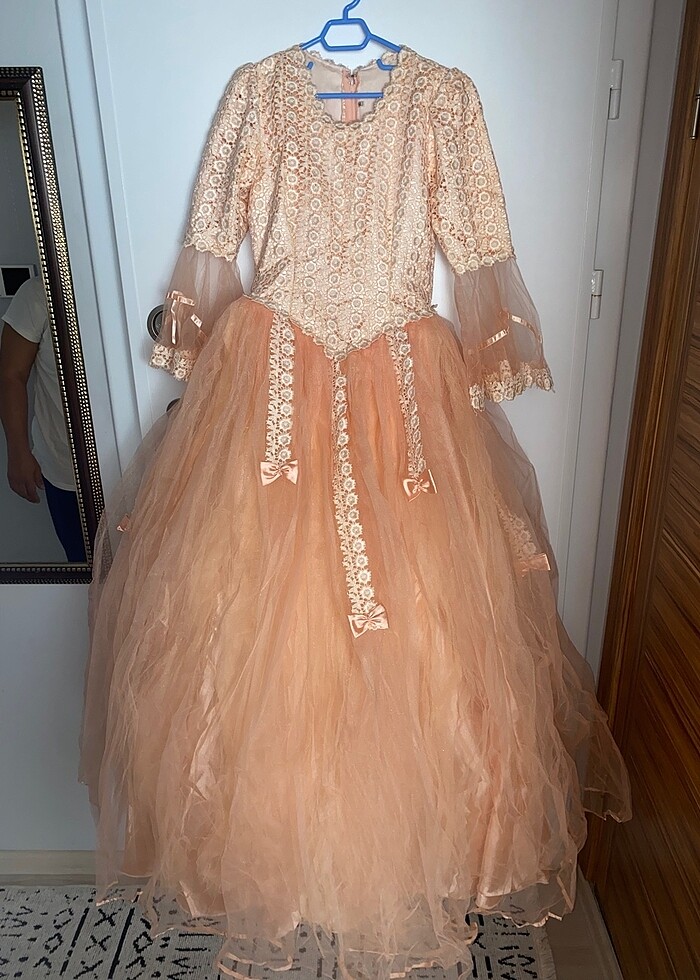 gençken giyinmiştim 24 senedir de duruyor satayım dedim çok güzel bir tuvalet,abiye hiç bir yerinde bir şey yok sapsağlam sadece ütüsüz evde duracagına satayım diyerekten satışa koyuyorum 38 bedendir ama 40 beden de üstü zayıf olan arkadaslara da olabilir sadece kol kısmının üstü biraz dar.(somon rengi)