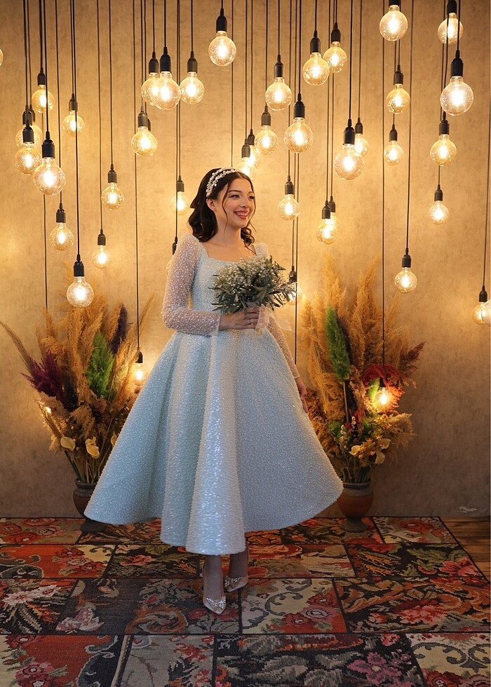 Ürün bana özel dikildi su yeşili elbise sadece 1 kez nişanımda giydim 56-58 kiloydum 36-38 bedene uyumlu