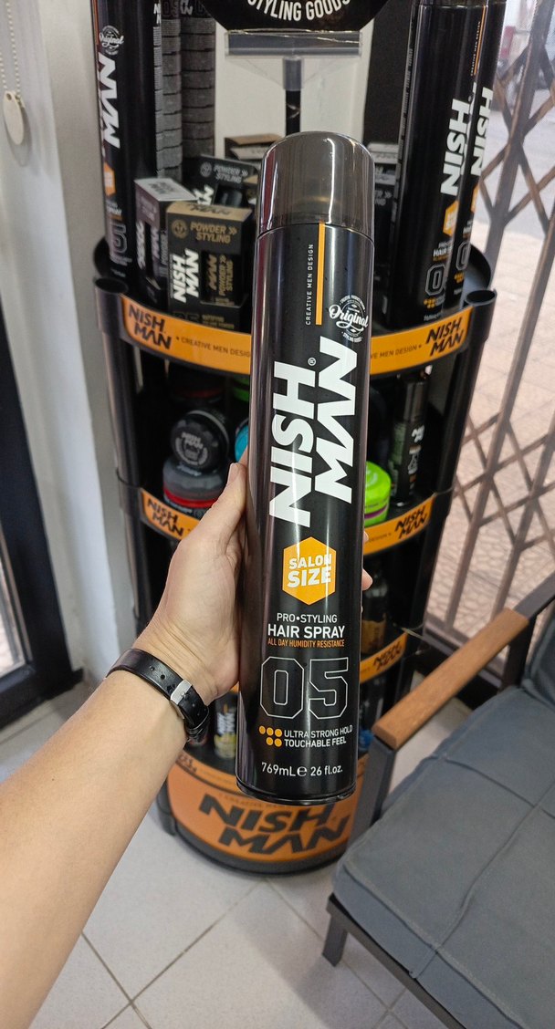 NISH MAN profesyonel saç spreyi, sertlik olmadan dokunulabilir uzun süreli tutuş sağlar. Salon boyu, 769 ml.