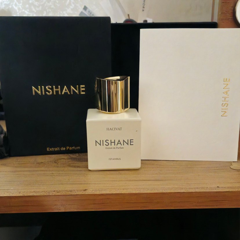 Nishane Hacivat erkek parfümü, altın kapaklı parlak beyaz şişede, minimalist ve bohem tarzda tasarlanmıştır. 5 ml 350 dir. Ürünüm tamamen orijinaldir. #nishane #nishanehacivat #hacivat #dekant