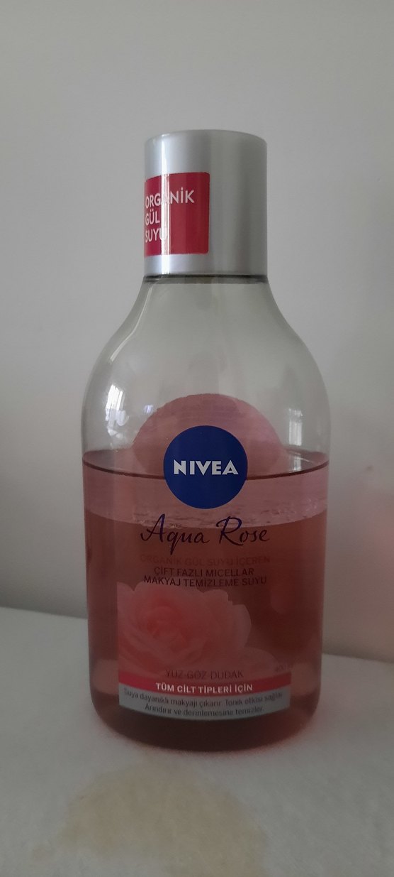 Nivea Aqua Rose micellar su, organik gül suyu formülüyle tüm cilt tipleri için makyajı nazikçe temizler ve canlandırır. Fotoğrafta göründüğü kadar kullanılmıştır.